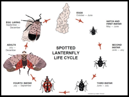 Spotted lanternfly is currently present in six states where it is under quarantine. Egg 4 nymphal sub-stages and adult. The Spotted Lanternfly goes through one life cycle a year in Pennsylvania.